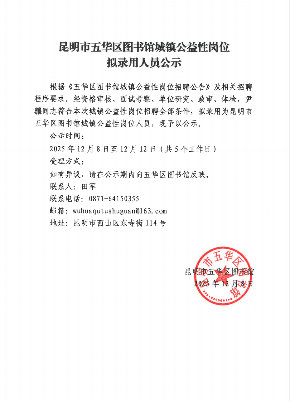 五华区图书馆城镇公益性岗位拟录用人员公示